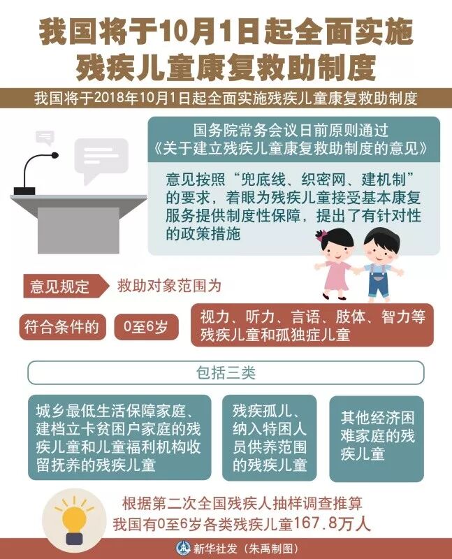 中国残疾人联合会副理事长贾勇6月1日在国务院新闻办公室召开的国务院政策例行吹风会上表示,我国将于2018年10月1日起全面实施残疾儿童康复救助制度。